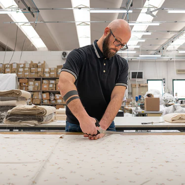 Handwerkliche Perfektion: Jedes Produkt wird in Deutschland mit traditionellen Techniken wie Rotationsdruck und handgeprüften Stichproben gefertigt.